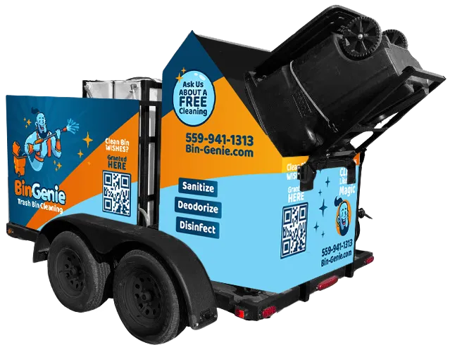 Our specialized trailer is custom made to clean garbage cans blasting them with 200° water through spray heads that reach every inch of your can. In just a few minutes, your garbage can is stink free and squeaky clean.
